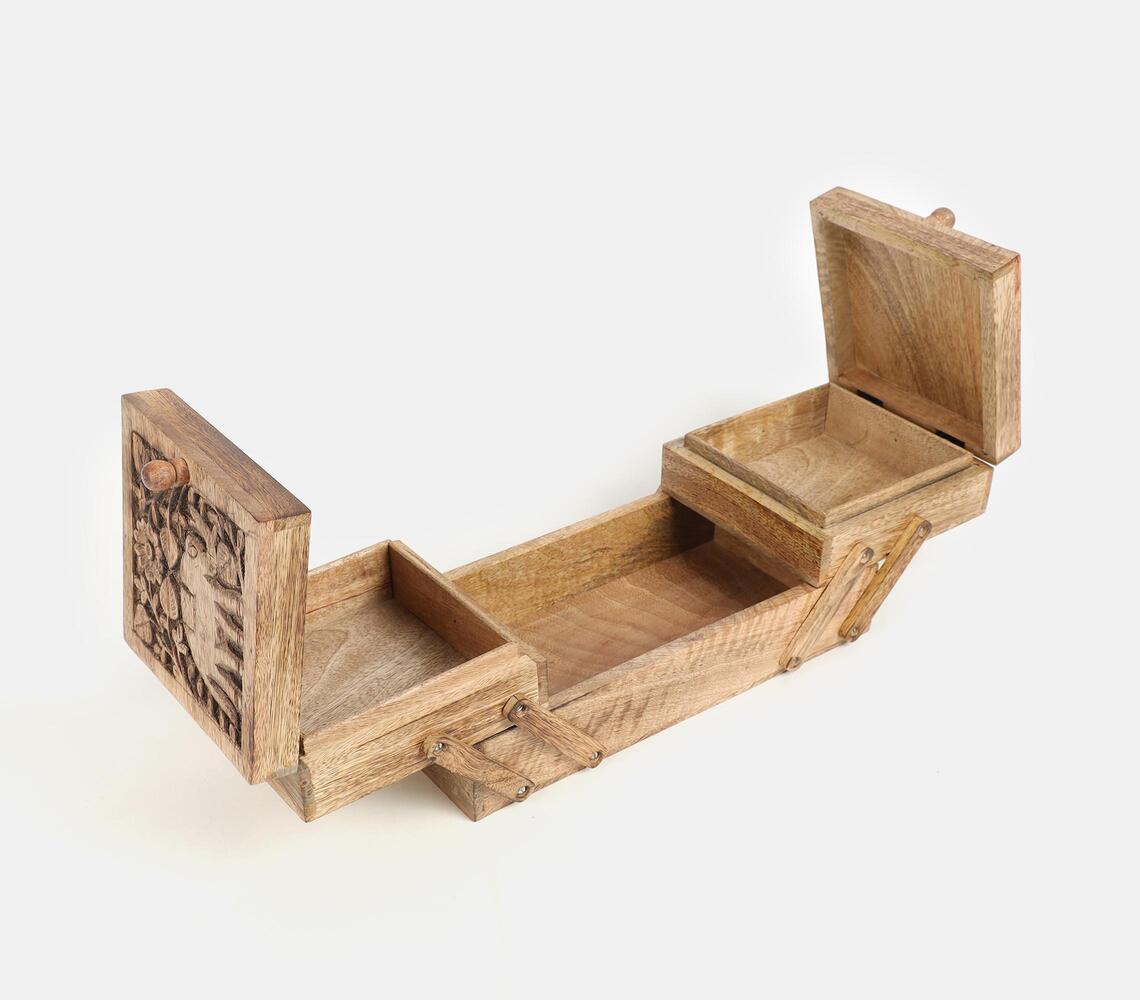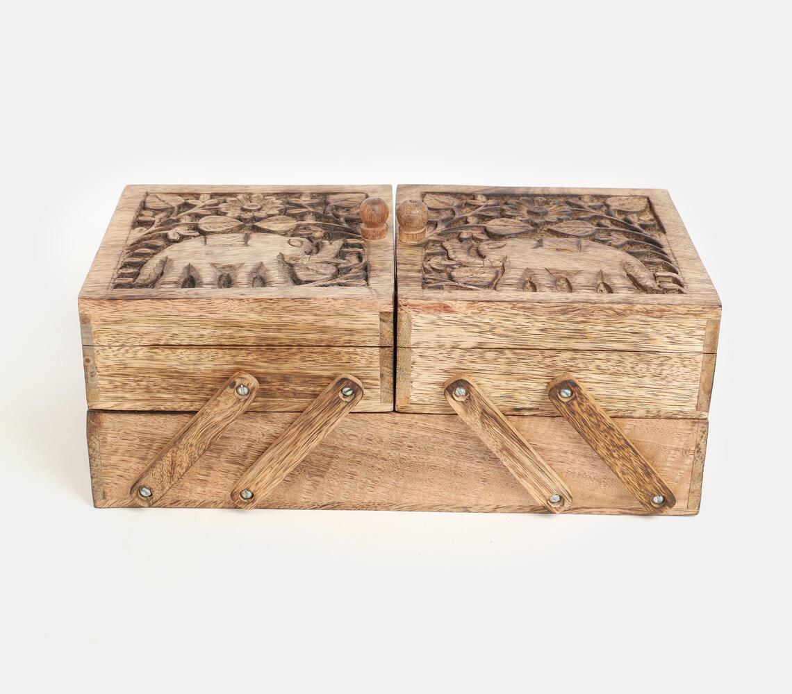 The handcrafted sewing box gives it an aesthetic character that sets it apart from regular storage utility. Beautiful designs hand carved on mango wood's wide variety of brown hues give them a raw, exotic personality that can take your customers set up to a whole new level. Mango wood is sturdy, low maintenance and yet never feels out of place with high taste or minimalist spaces. While the offering is sure to charm the table tops, its build allows frequent usage.