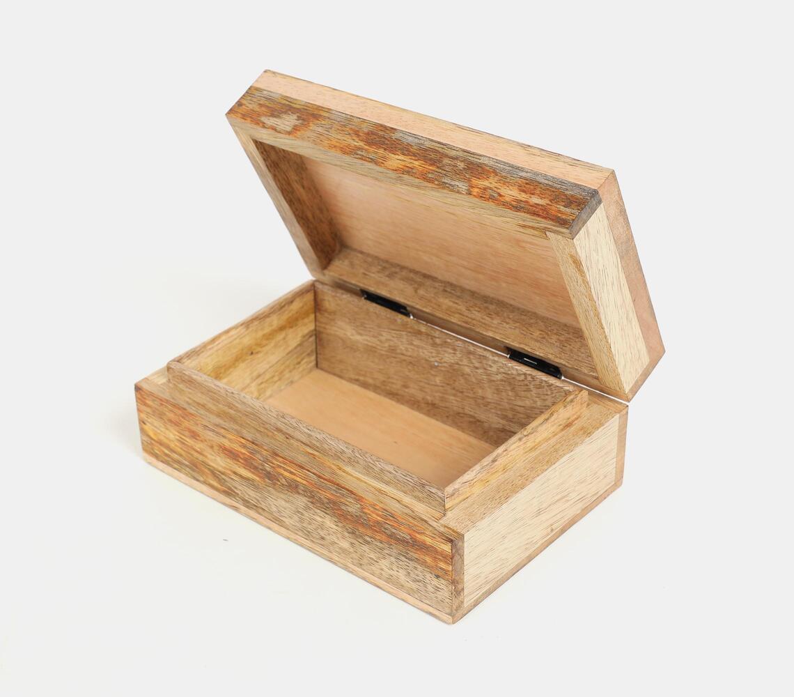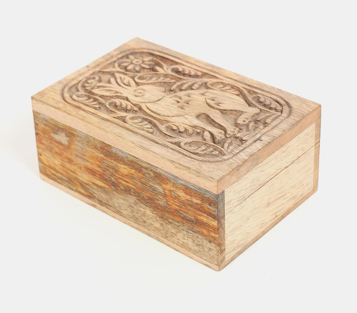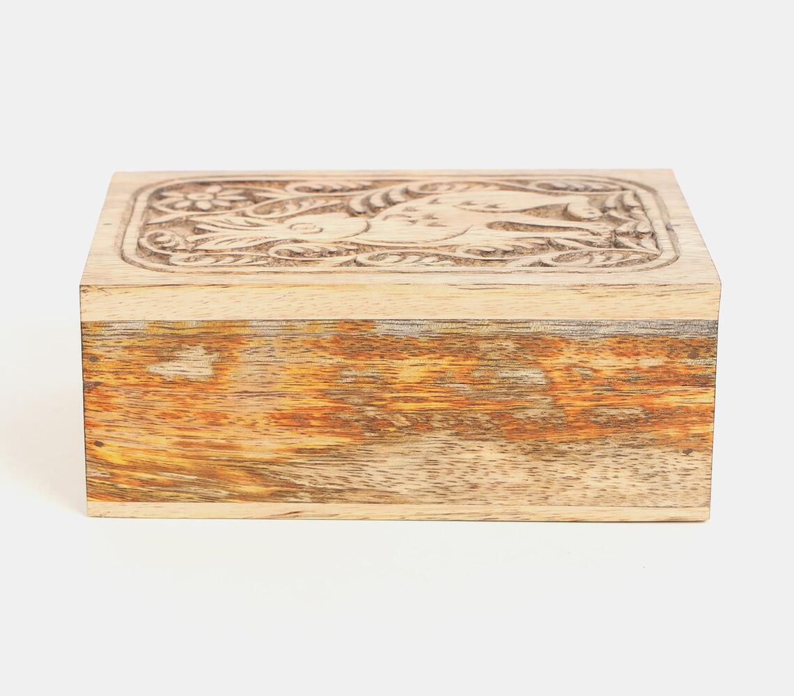 Seasoned wooden artisans have handcrafted this jewellery box giving it an aesthetic character that sets it apart from regular storage utility. Beautiful designs hand carved on mango wood's wide variety of brown hues give them a raw, exotic personality that can take your customers' dressing set up to a whole new level. Mango wood is sturdy, low maintenance and yet never feels out of place with high taste or minimalist spaces. While the offering is sure to charm the table tops, its build allows frequent usage.