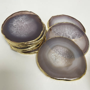 Grey agate coasters are decorative items made from natural agate stones that feature a grey colouration. Agate is a variety of chalcedony, which is a type of mineral that is typically translucent and banded in appearance. Agate coasters are often cut from a larger agate stone and then polished to reveal the intricate and unique patterns that are characteristic of agate. The natural grey colour of the stone is often accentuated through the polishing process, giving the coaster a sleek and elegant appearance.