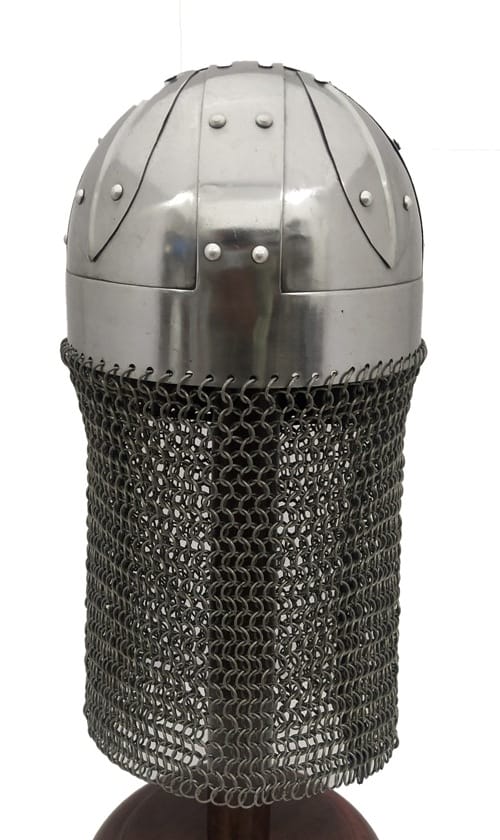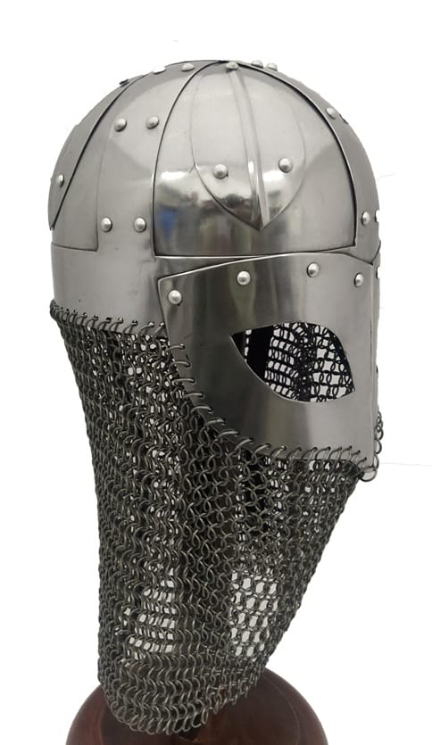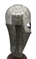 If you are a Viking enthusiast, you'll love the Viking Ocular Helmet with Chainmail. This headgear is modeled after the spangen helm style which has a conical design that curves with the shape of the head and meets at a point with a framework of metal strips. this piece has a blackened interior with an adjustable leather suspension liner and an adjustable chin strap with a brass buckle to ensure a secure fit. Enhanced protection is provided with the inclusion of butted, mild steel chainmail. With an authentic appearance, this helmet is great for costumes, re-enactments, and display.