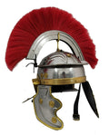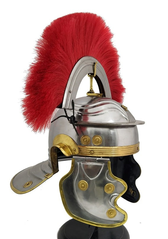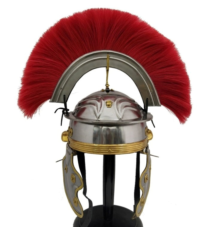 The Imperial Gallic H is a replica based on the Augsburg original and numerous fragments belonging to this type, all dated to the third or fourth quarter of the 1st century AD. Our Roman Gallic H Centurion helmet includes the red horsehair crest. There will be no question of your position in the Roman army when you wear this Gallic H Centurion Roman helmet for your next re-enactment. This is one superbly crafted and stunning helmet that any legendary leader would have been proud to wear. Our replica has been created from 18-gauge steel and thoughtfully decorated with brass fittings and accents.