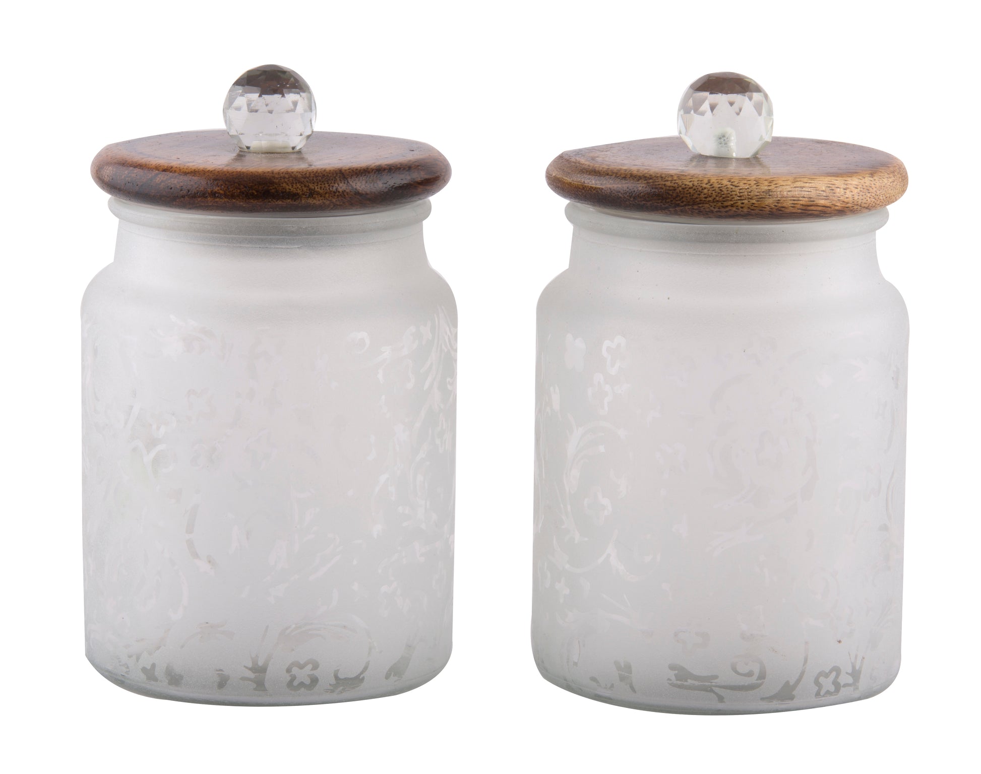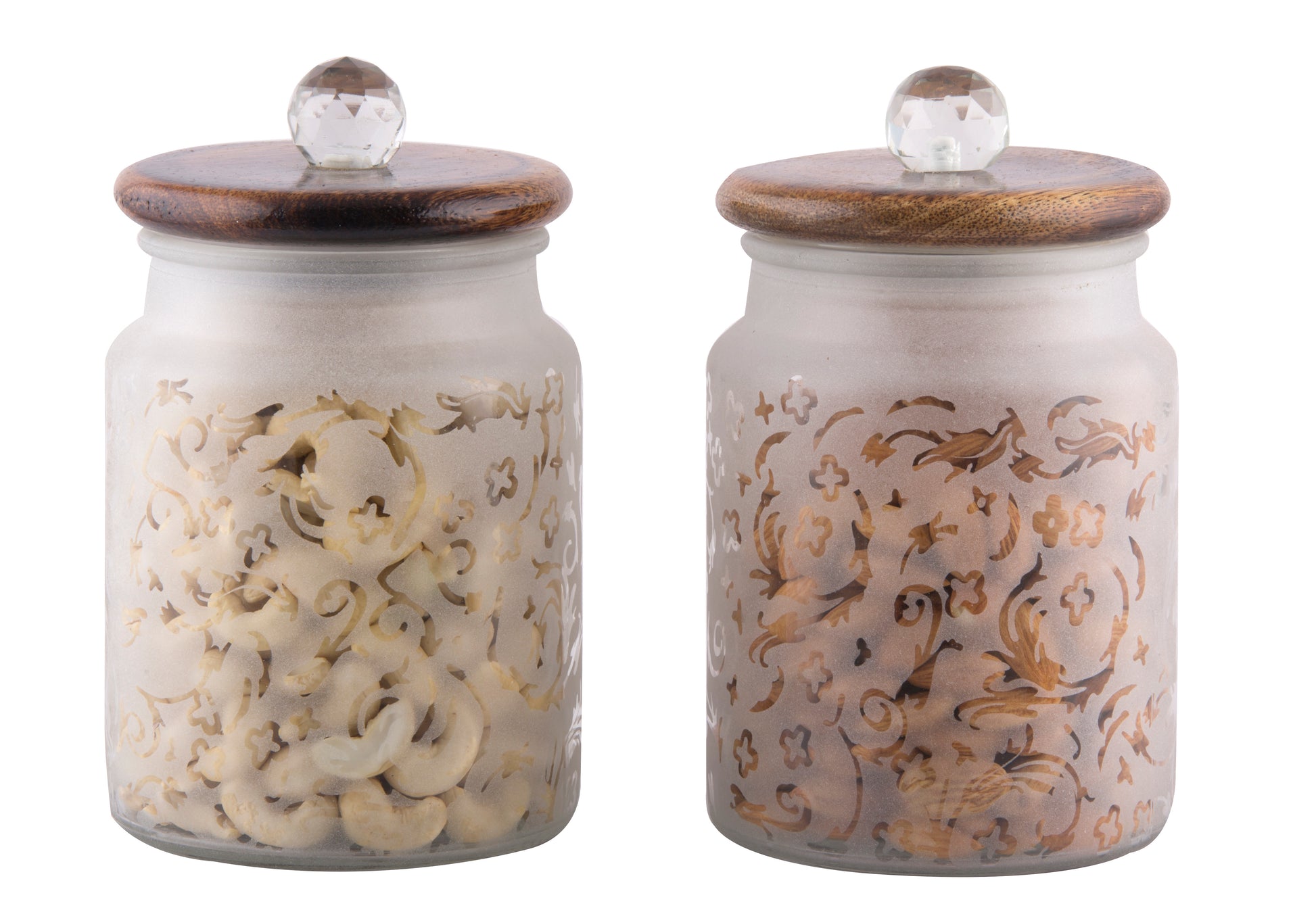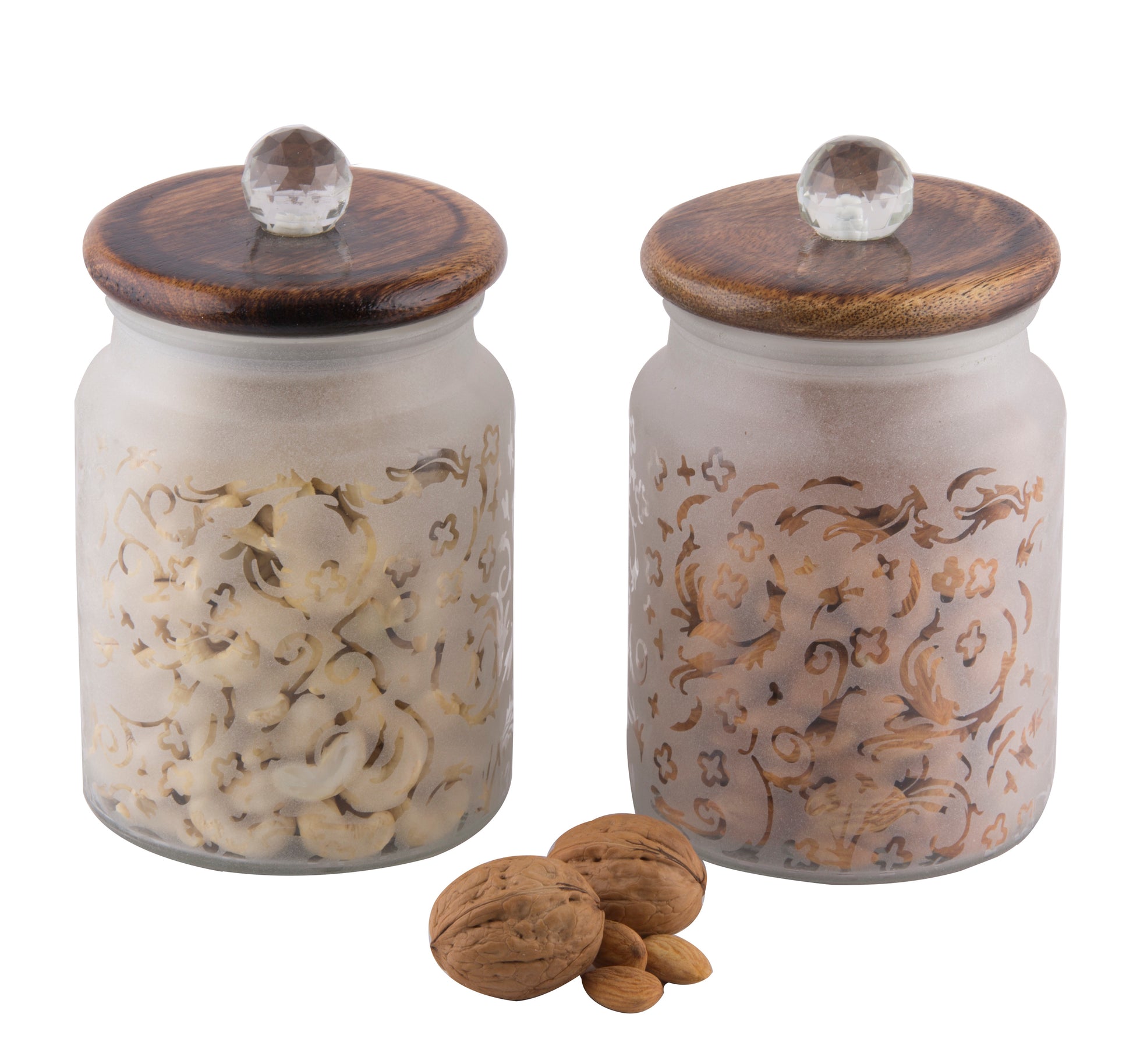 Floral Glass Jar With Wooden Lid- Set Of 2