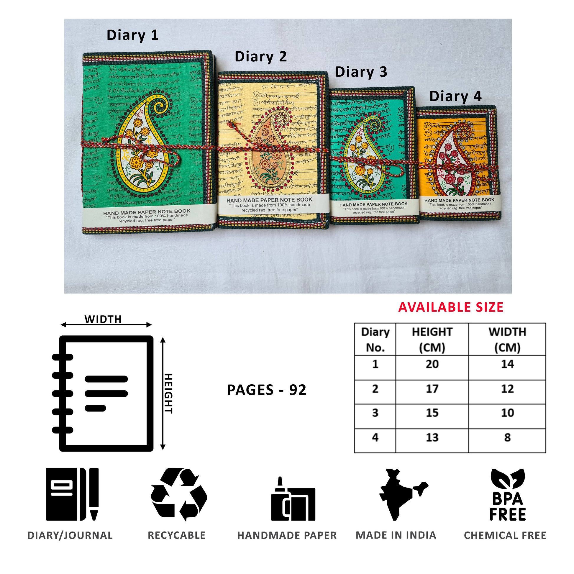 - Dimensions: (Diary 1)-20x14cm, (Diary 2)-17x12, (Diary 3)-15x10, (Diary 4)-13x8 (All in cm)