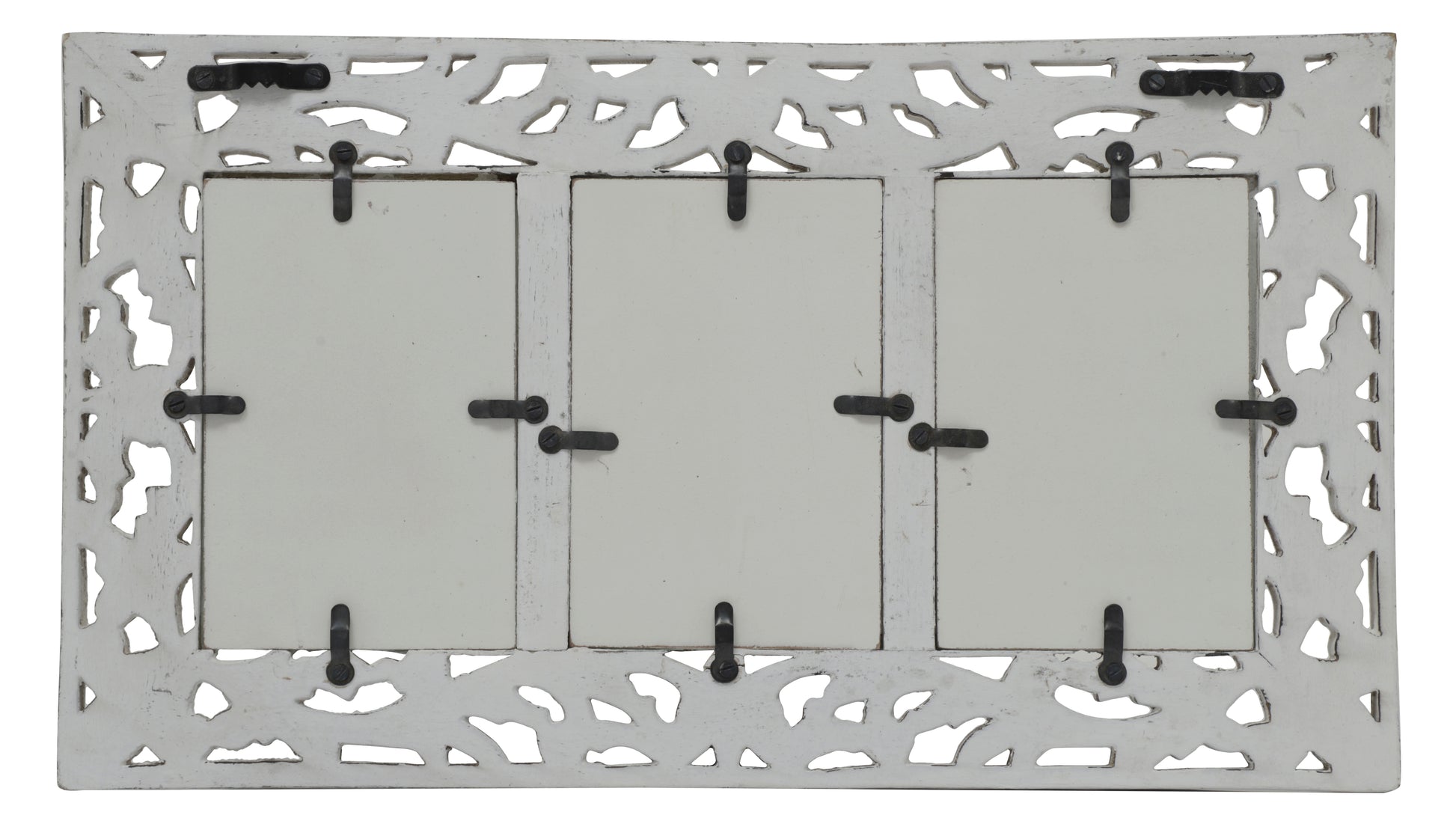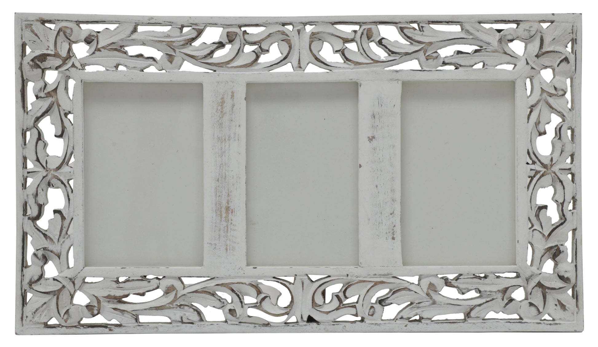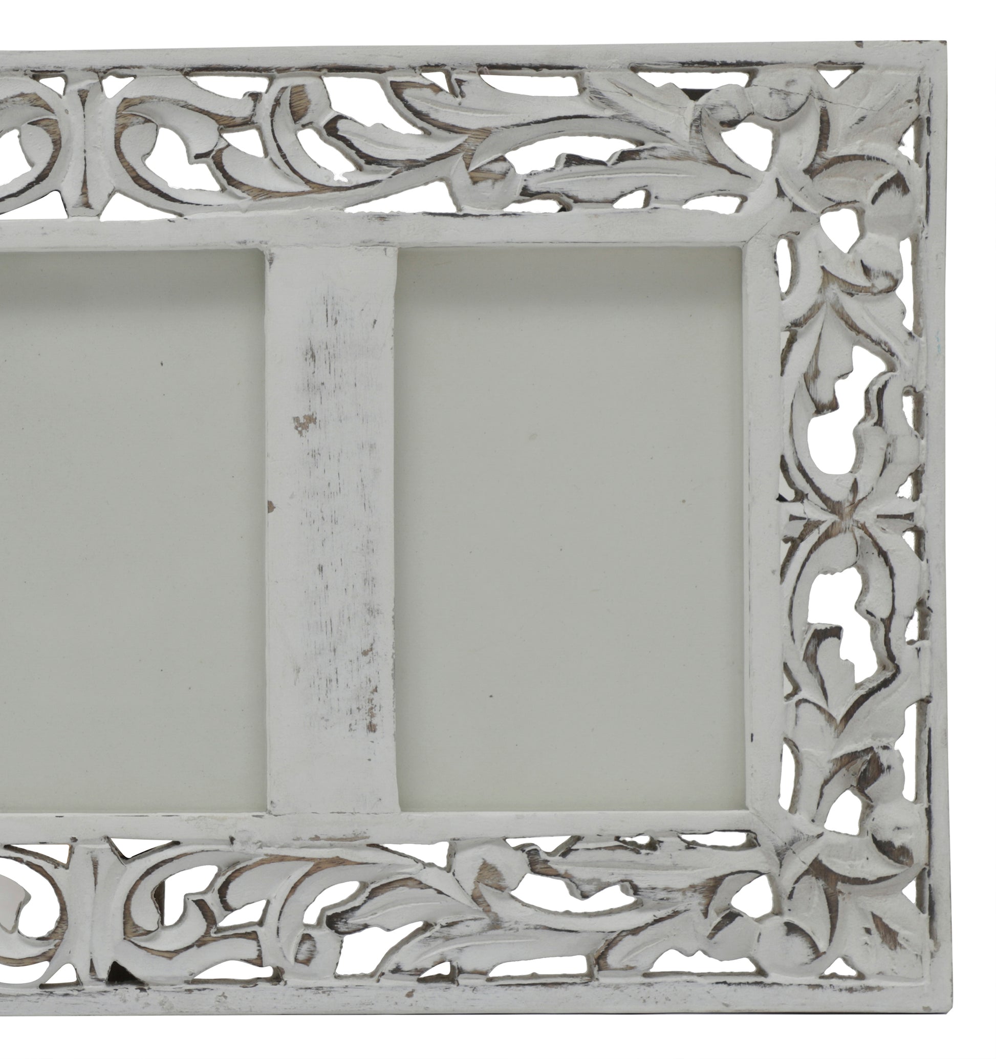 Our intricately carved mango wood picture frames feature an eye-catching foliage design to really show off any special photo. This white colored wood carved photo frame with black golden foil effect has been designed to hold three photos of 4x6 inch size. All our beautiful frames are made from mango wood, one of the most sustainable woods known to man.