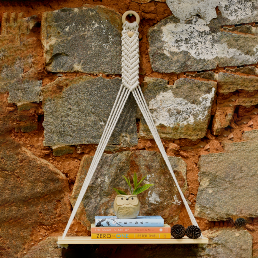 Looking for elegant ways to display home decor or your favourite plant in your home or office. This macrame wall hanging shelf does just that for you. Use this handmade macrame wooden shelf to place your precious home decorative items or books or anything else you want to store or display in your living room, bedroom, bathroom or your home office.