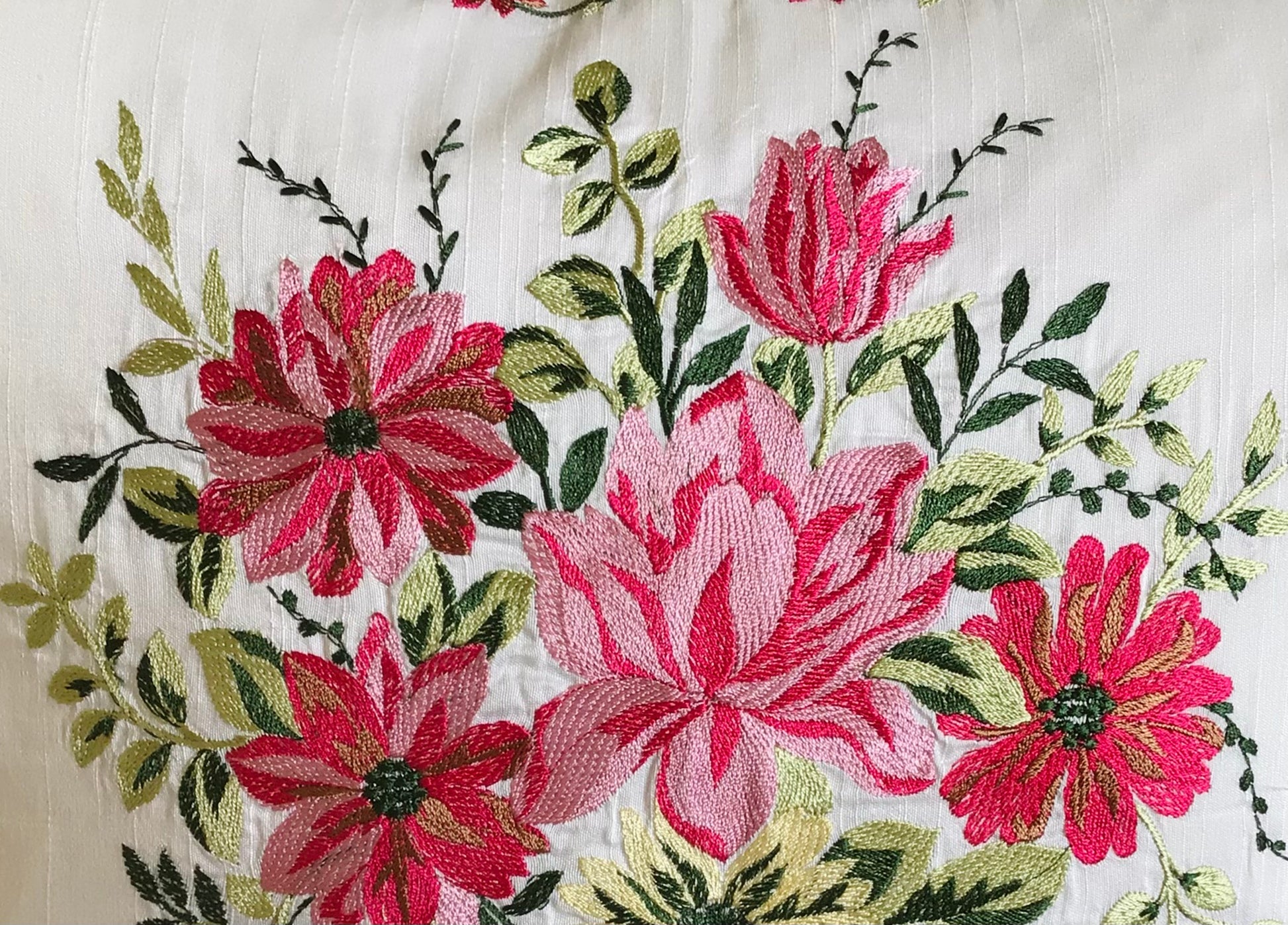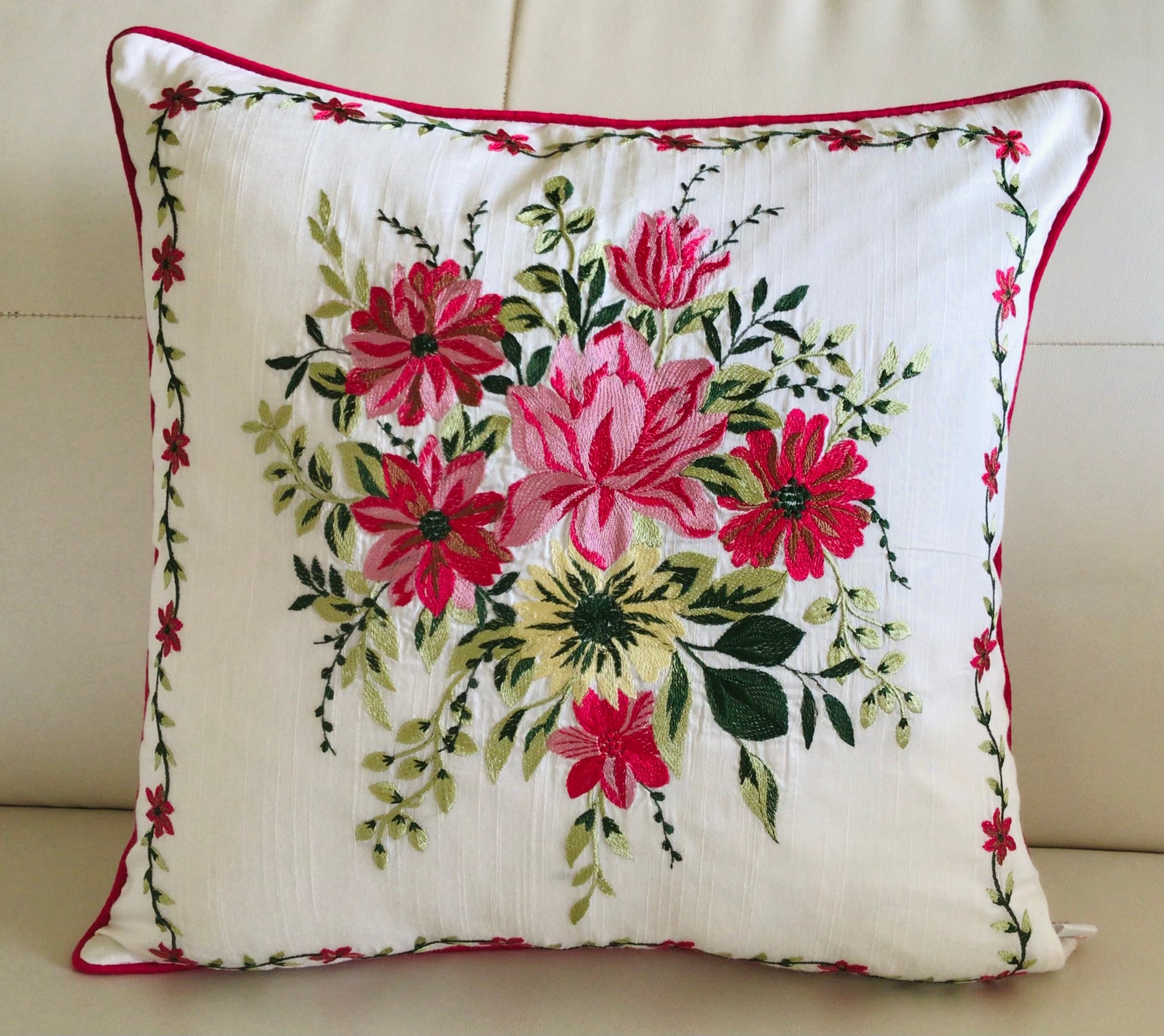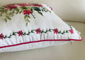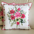 My Fair Lady - We are excited to present an elegant and enchanting embroidered cushion cover - My Fair Lady. A beautiful bunch of embroidered foliage, flowers, rocaille elements, and leaves arranged in an elegantly sinuous development typical of collections. The sequence of colors moves smoothly from the varied shades of pink to the serene green and lively lemon absolutely like the natural flowers and foliage. Set in a floral bordered frame with piped pink edges. It's a classic beauty.