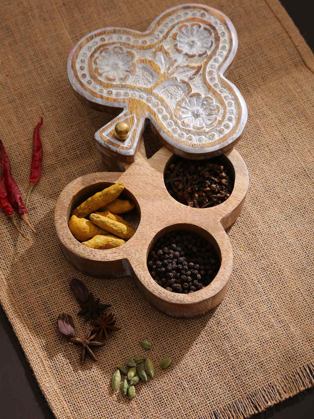 Traditional beautifully carved handcrafted vintage spice box. It can be used to store nuts or saunf, supari, mishri, elaichi. Spruce up your kitchen as a spice box or use it on your dining table.