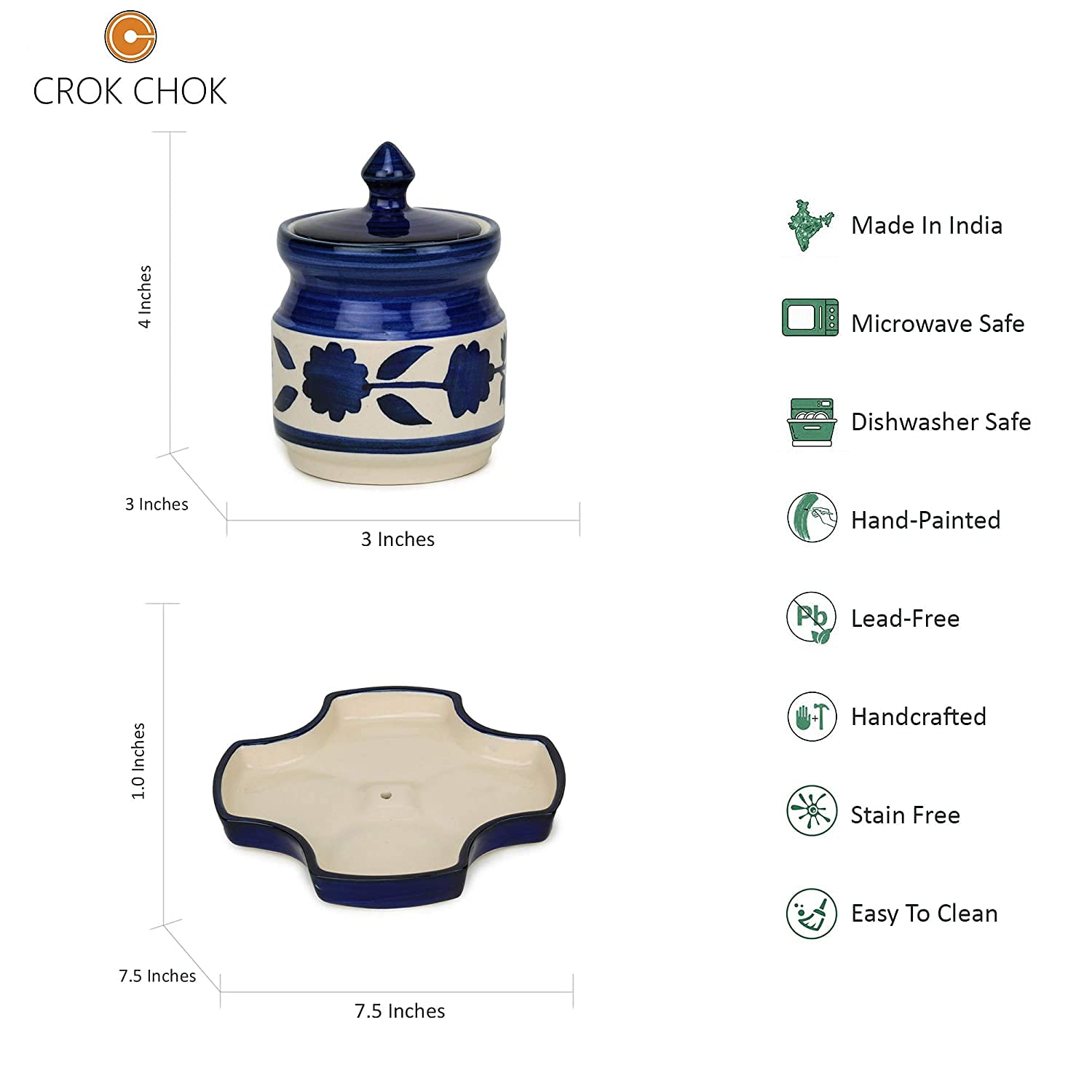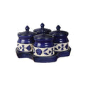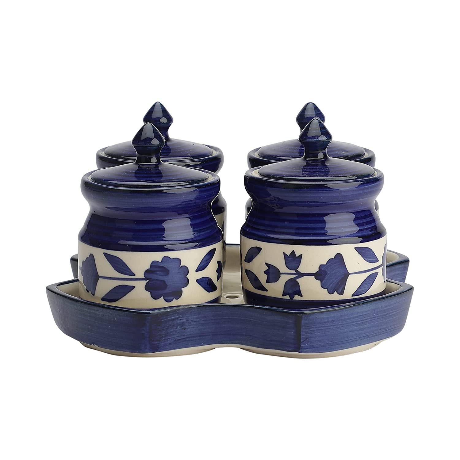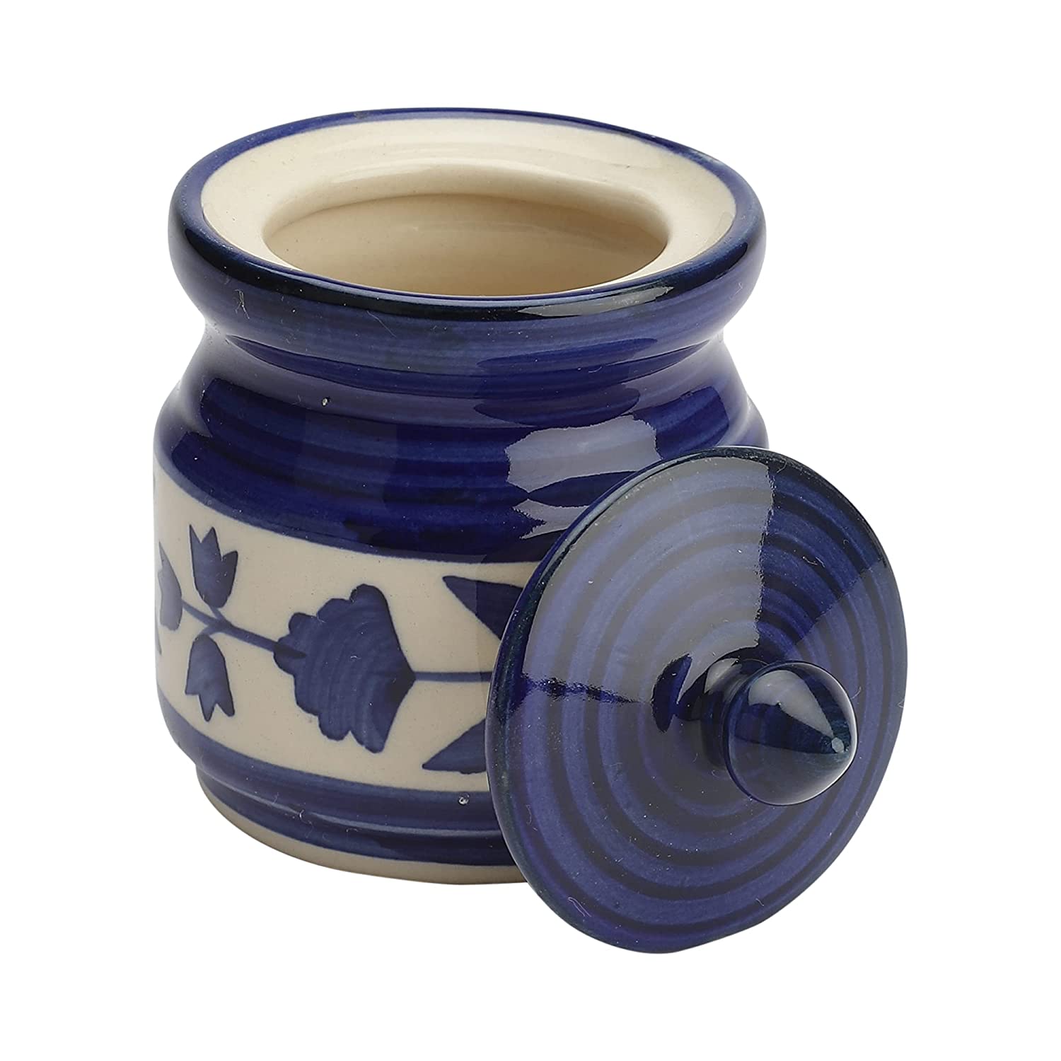Blue Ceramic Handcrafted Multipurpose Dining Table Top Pickle Jar Storage Container With Tray