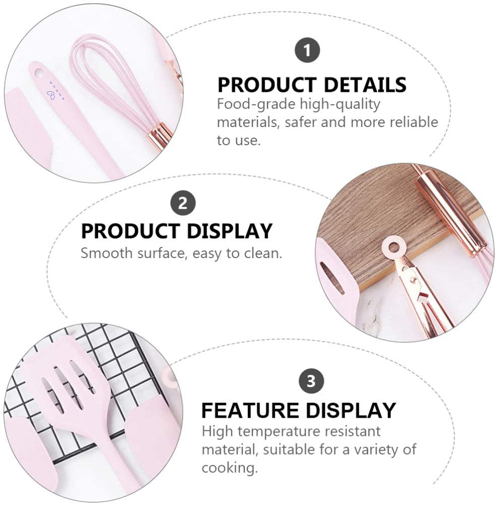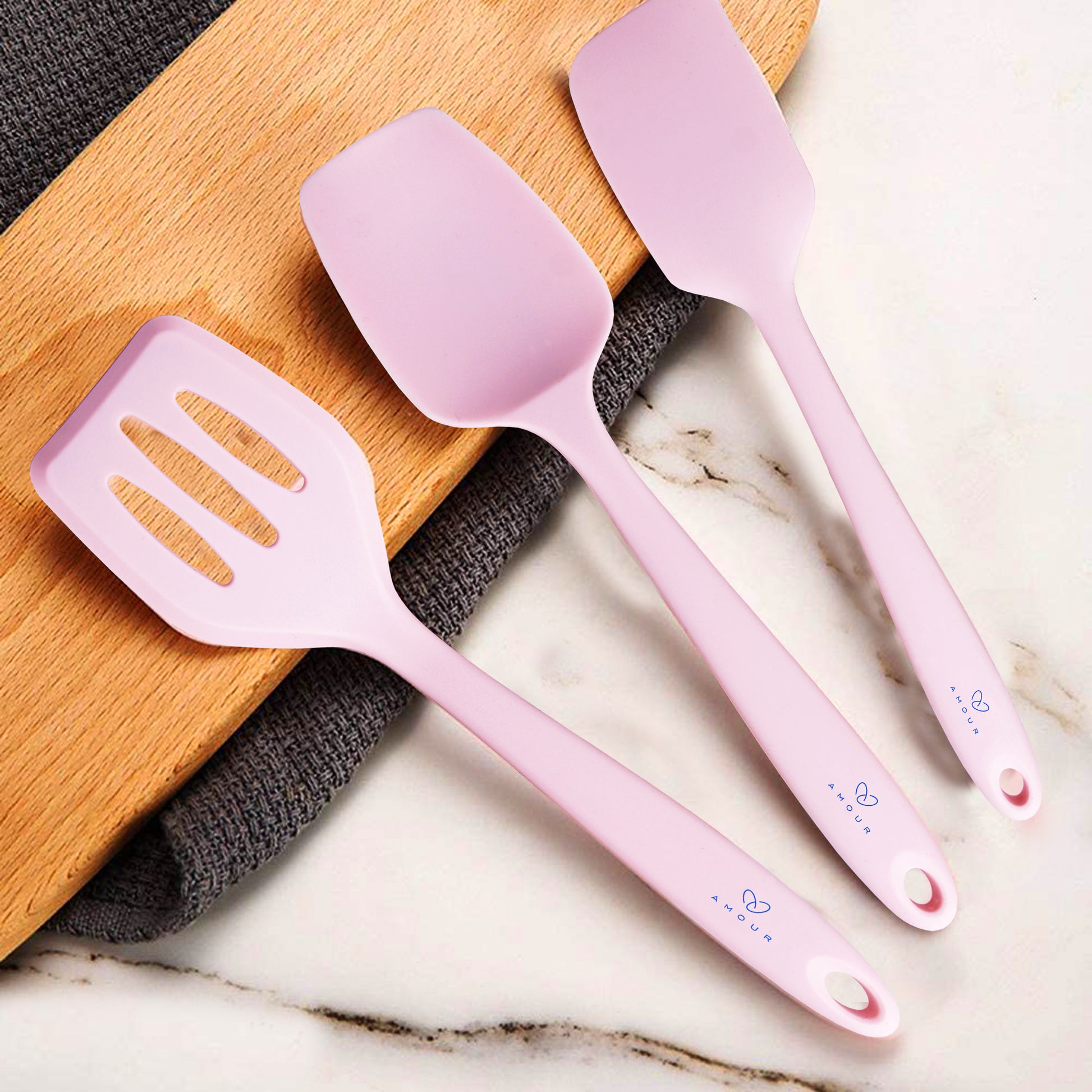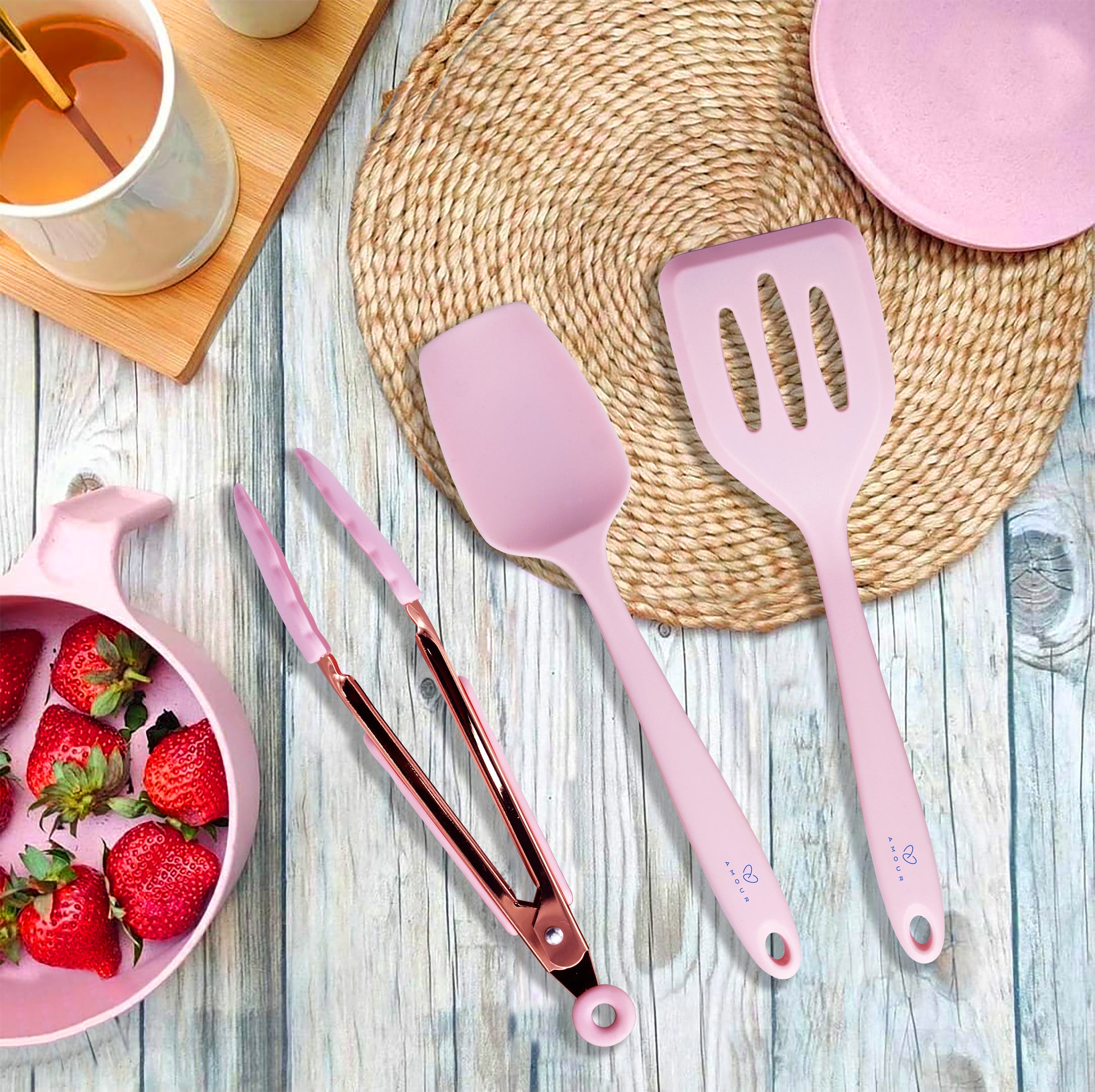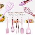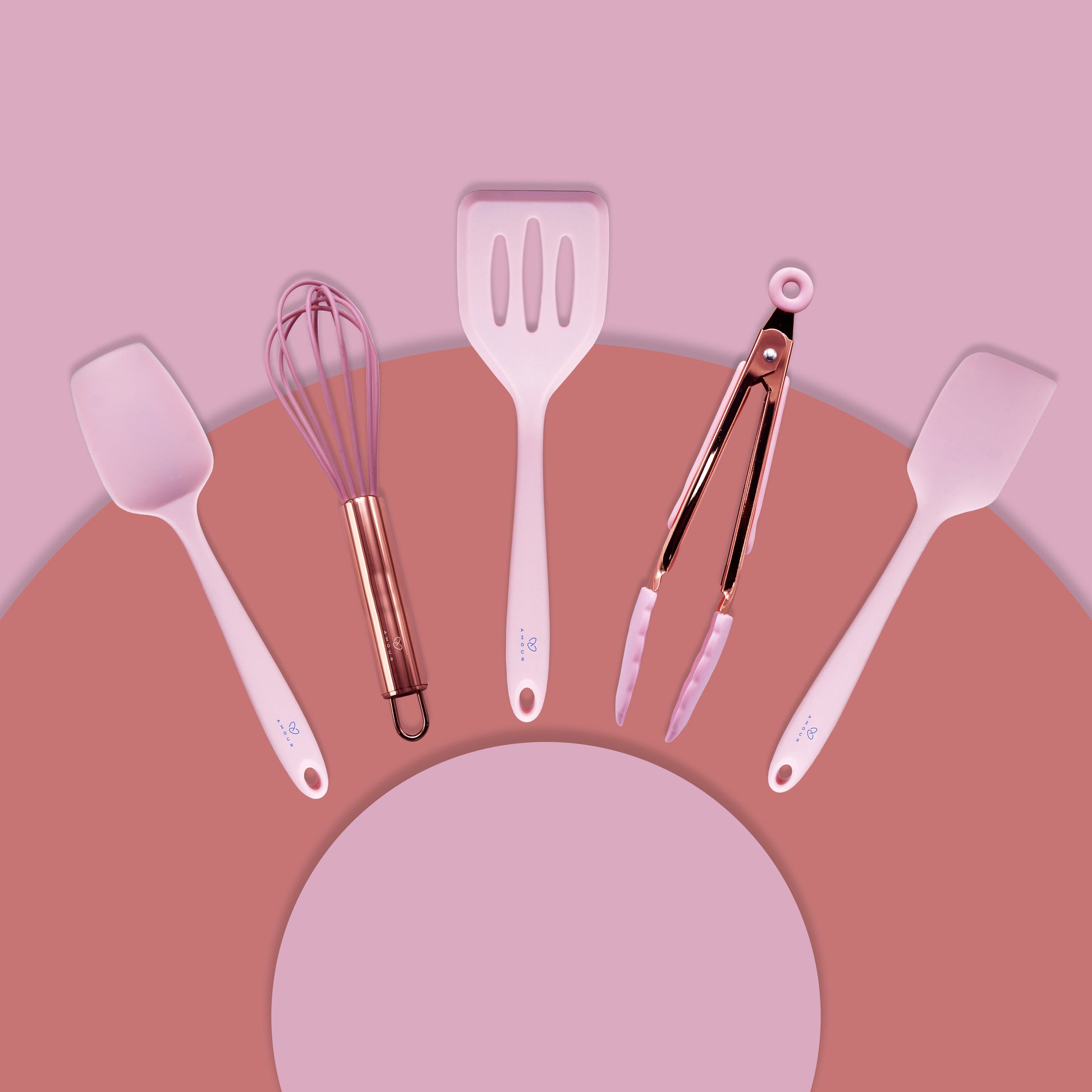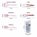 - Designed in a fresh and bright pink color and a rose gold metallic tone, this set of mini silicone kitchen tools has an up-to-date, trendy look that is madly in line with the current styles and trends. Add a splash of color and funk to your kitchen and hang from the rings on each utensil. Cook, bake, grill, and serve with fun and fashion at the same time. Perfect for an impressive gift as well.