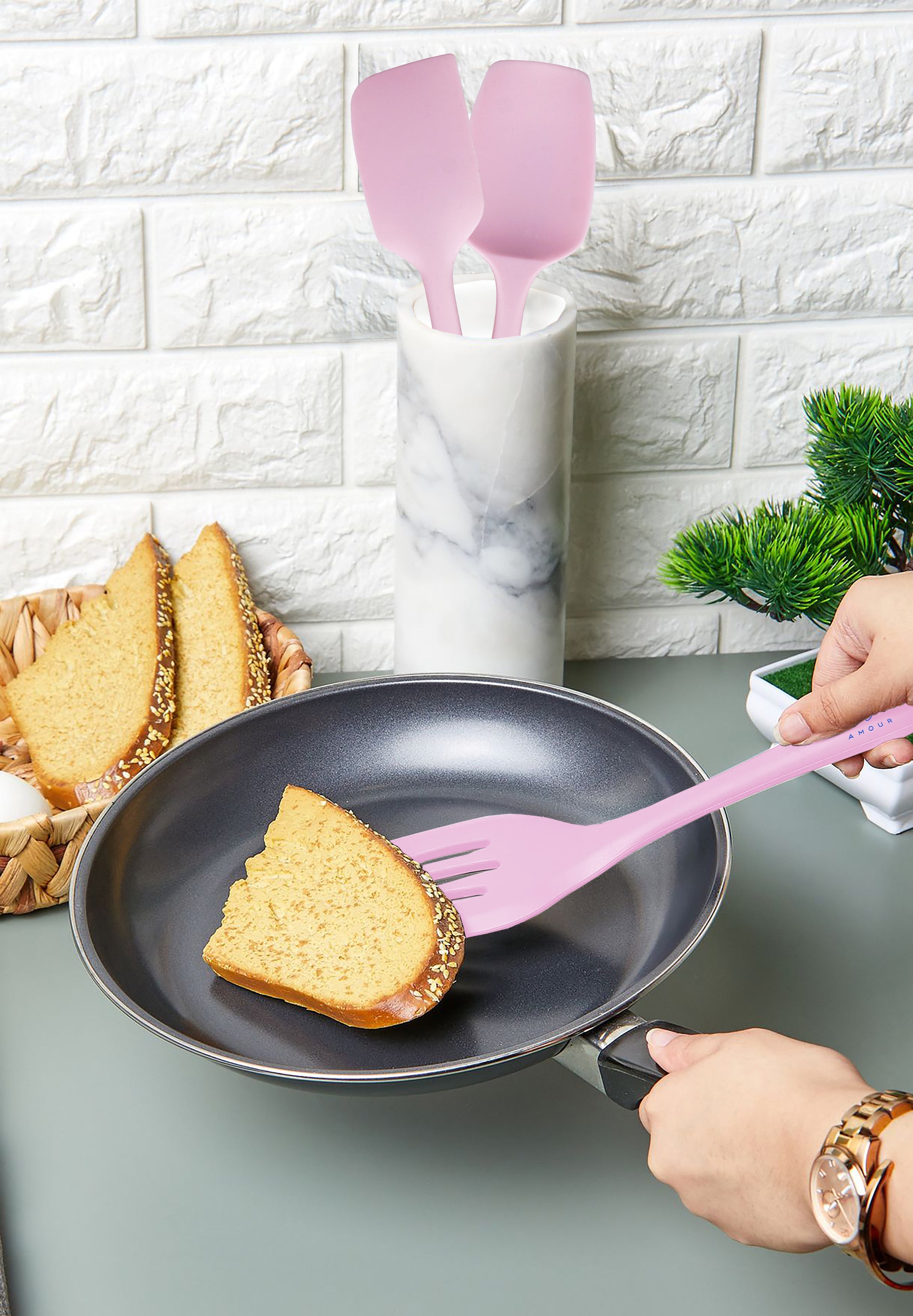 - Dimensions (L x B): Slotted turner- 21cm x 5.7 cm, Spoonula- 20cm x 4.5cm, Spatula- 21cm x 4cm, Tong- 21cm x 4.5cm, Whisk- 20.5cm x 5cm