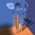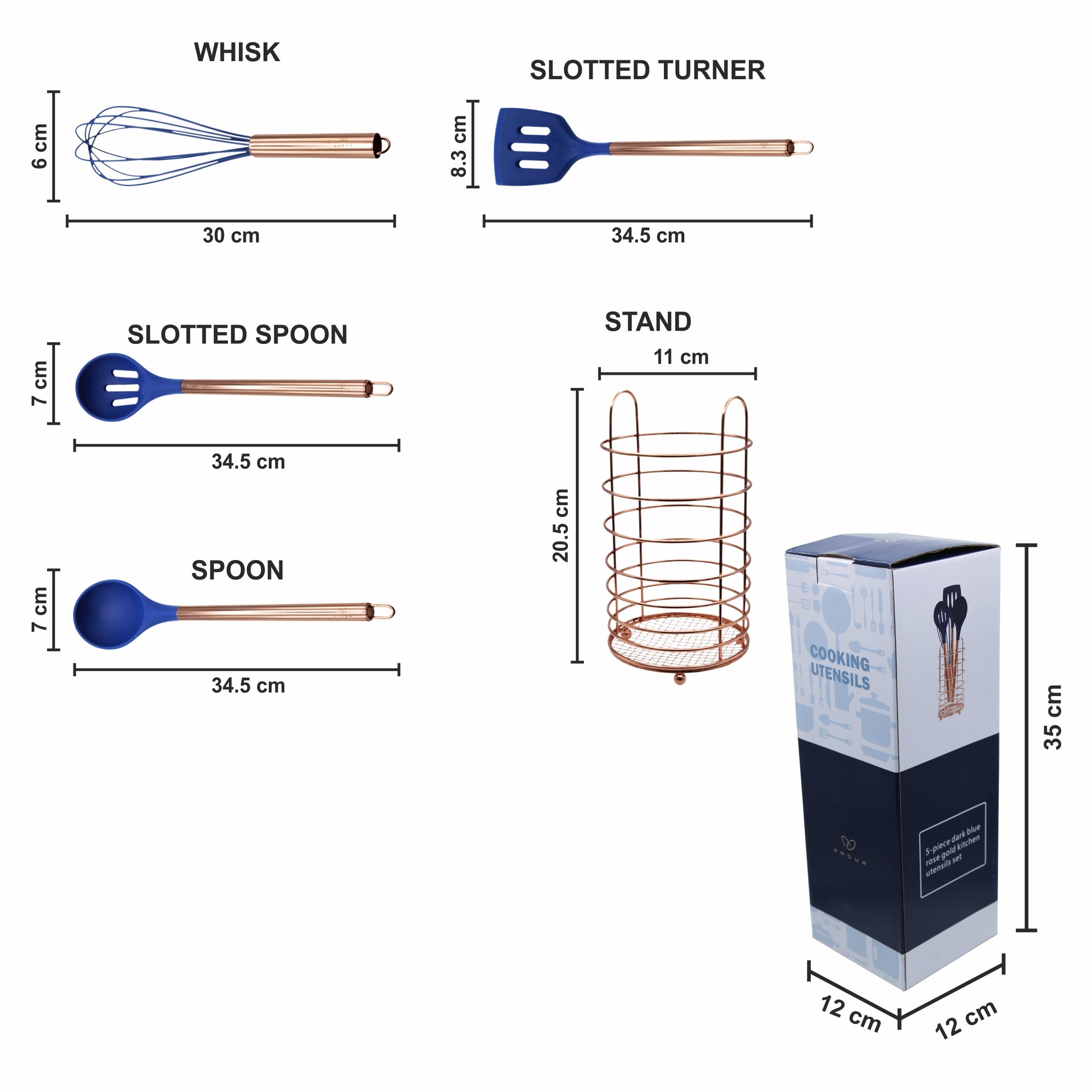 - Dimensions (L x B): Slotted Turner- 34.5cm x 8.3cm, Slotted spoon- 34.5cm x 7cm, Whisk- 30cm x 6cm, Spoon- 34.5cm x 7cm and Attractive stand- 20.5cm x 11cm.