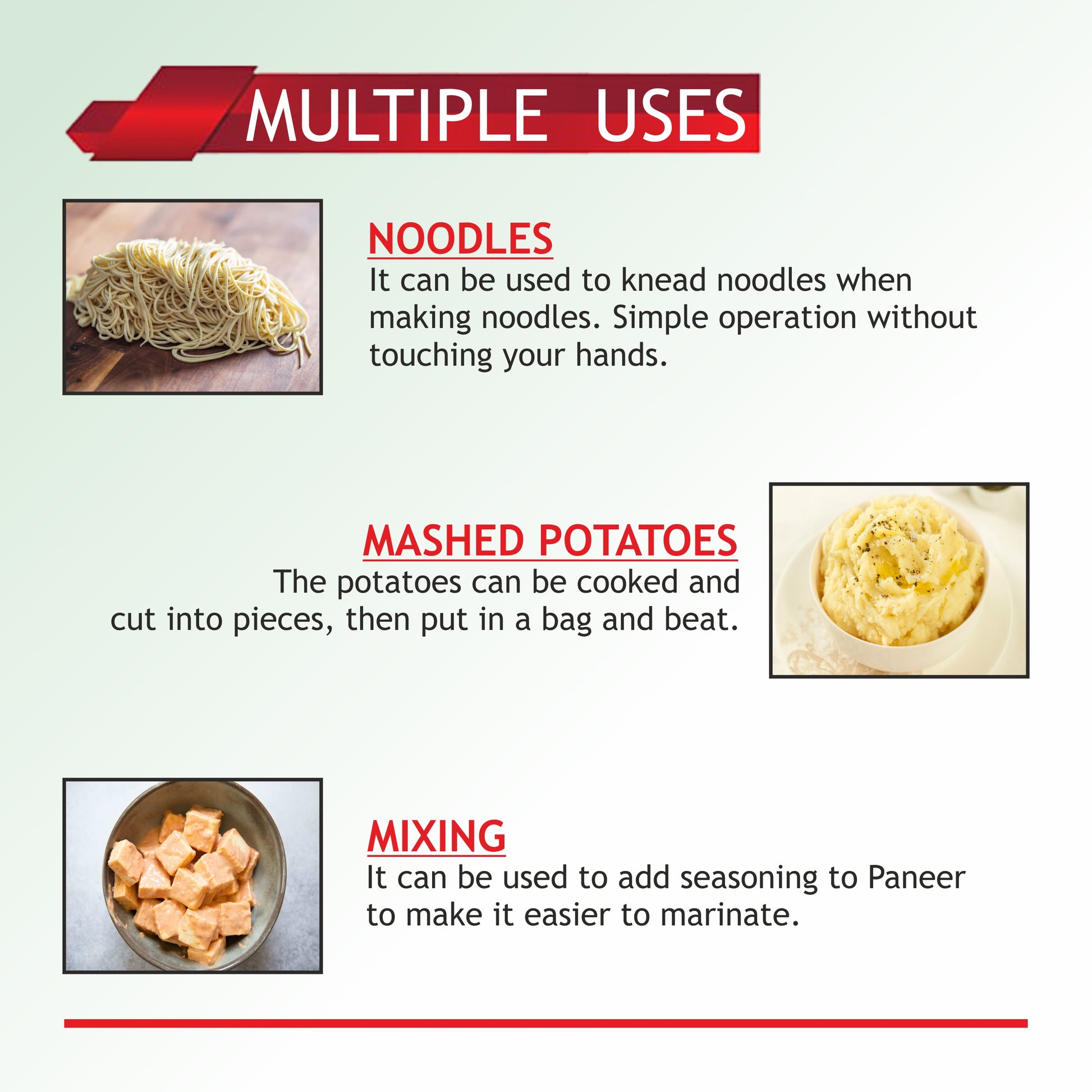 - PERFECT FOR KNEADING & MARINATES: Just add the ingredients such as flour, water, eggs mix all together, tie up the bag and start kneading. For marinating meats or fish, pour ingredients in, tie the bag and pour in fridge. Also can be used for pressing fruit and vegetable, making purée.